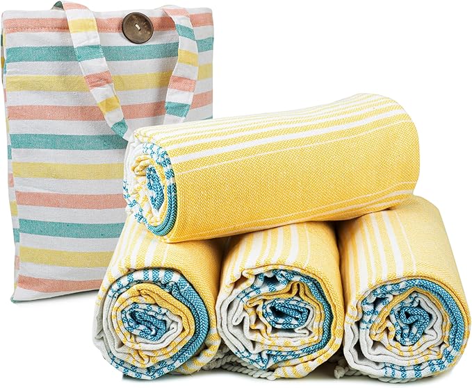HILLFAIR Cotton Turkish Beach Towels, Quick Dry Lightweight Sand Free Peshtemal Towel for Bath Swim Yoga Travel, Beach Accessories, Oversized Cotton Turkish Towels (39 x 72 inch- 4 Pack Yellow Blue)