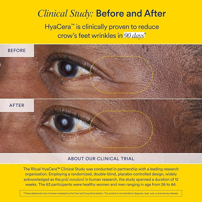 - CLINICALLY PROVEN RESULTS: HyaCera is clinically proven to reduce wrinkles & fine lines and improve skin smoothness in 90 days.* Our formula is vegan, sugar-free, gluten-free, dairy-free, nut-free, soy-free, and formulated without stevia, sugar alcohols, and artificial colors, flavors, or sweeteners.
