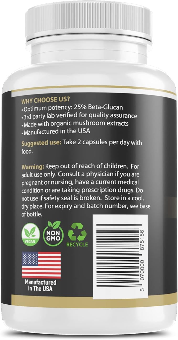 - OPTIMUM POTENCY BETA GLUCAN SUPPLEMENTS - Our product contains 25% beta glucan content. Choosing a product with a higher beta glucan content can offer more potential health benefits than those with lower beta glucan content. At more than 25% beta glucan content, our product contains some of the highest levels of beta glucan available per capsule.