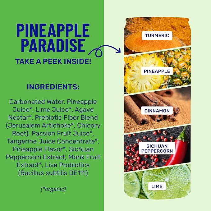 - REFRESHING HINT OF PARADISE: Sun-kissed pineapple, zesty lime, and citrusy tangerine juice come together for a poolside getaway in a can. A light twist of Sichuan peppercorn rounds out this tropical flavor with a warm, subtle spice.