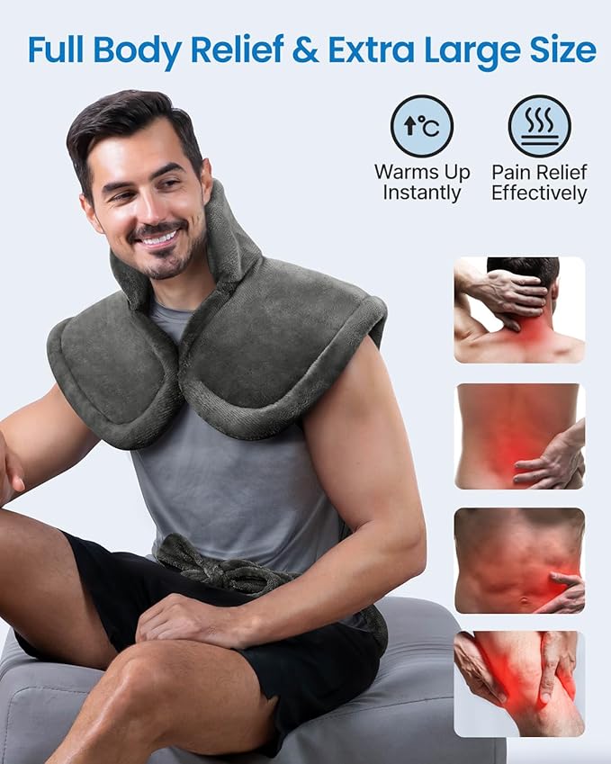 - Soft materials & Easy to Wear: Made from super soft flannel that helps the travel heating pad spread heat more evenly to maximum comfort. This heating pad for neck and shoulders and back is very easy to wear, just drape it over your back, then button it up and fasten the two straps. The edges are weighted so it can fits perfectly to the body but not too heavy. It's a useful white elephant gifts and stocking stuffers for adults women men