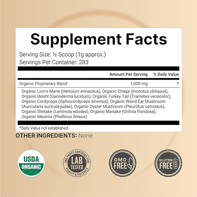- Special Ingredients : Lion's Mane, Chaga, Reishi, Turkey Tail, Cordyceps, Wood Ear, Oyster, Shiitake, Maitake, and Mesima Lion's Mane, Chaga, Reishi, Turkey Tail, Cordyceps, Wood Ear, Oyster, Shiitake, Maitake, and Mesima