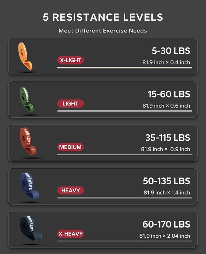 - [ 5 Pcs with Varying Resistance Levels ] Our pull up assistance bands come with 5 resistance levels, which increase in layers, and you can switch combinations freely. X-LIGHT: 5-30 LBS, LIGHT: 15-60 LBS, MEDIUM: 35-110 LBS, HEAVY: 50-135 LBS, X-HEAVY: 60-170 LBS. The avant-garde and fashionable colorful will bring you a completely different experience in vision and use.