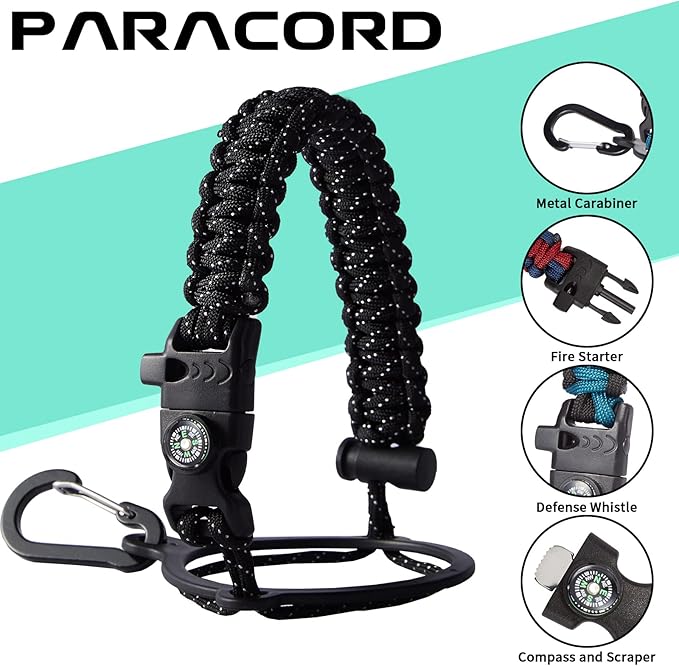 - UNIQUE DESIGNS PARACORD HANDLE: Full-function paracord handle made in individual styles to match the color of the flask water bottles. With compass, safety ring, carabiner, flint fire starter & whistle. It unravels into a sturdy and taut rope in an emergency, making the large water jug an ideal survival kit for expeditions in the wild