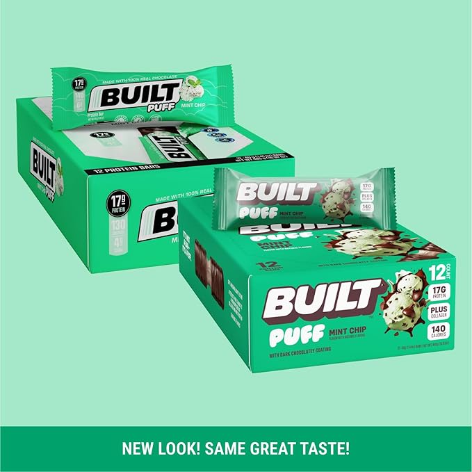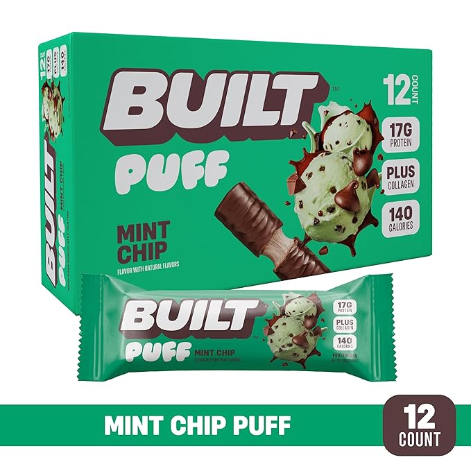 Built Bar, Puff Protein Bars, Mint Chip Puff, 17g Protein Snacks, On-The-Go Bars, Only 140 Calories, 6g Sugar, Collagen, Gluten Free, 12 Count