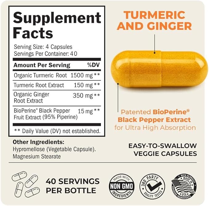 - 40-Day Supply Per Bottle: Enjoy over a month of joint, immune support, and antioxidant benefits with our extra-strength turmeric ginger black pepper supplement capsules.