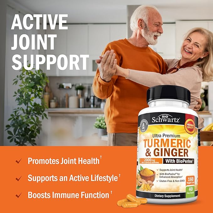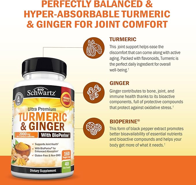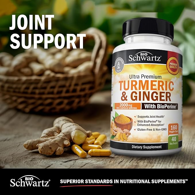 BioSchwartz Turmeric Curcumin and Ginger 2,000 mg 95% Curcuminoids + BioPerine Black Pepper for 20× Absorption – Joint & Knee Support, Heart, Immune & Digestive Support – Non-GMO, Vegan, 160 Caps