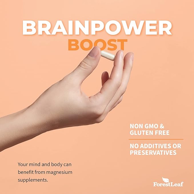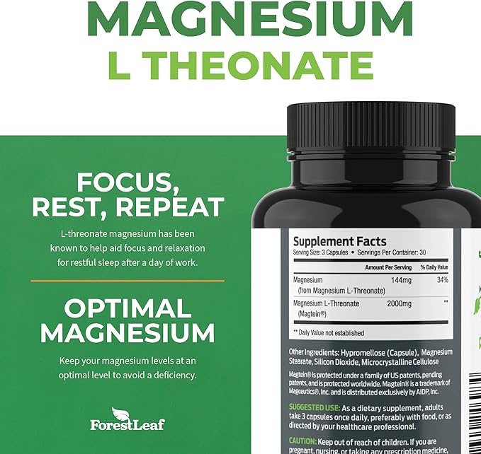 Forest Leaf Magnesium L-Threonate Magtein Capsules - 2000mg Magnesium Threonate Supplement Supports Cognitive Function, Focus, Brain, Deep Calm and Sleep for Men & Women | 90 Powder Veg Caps