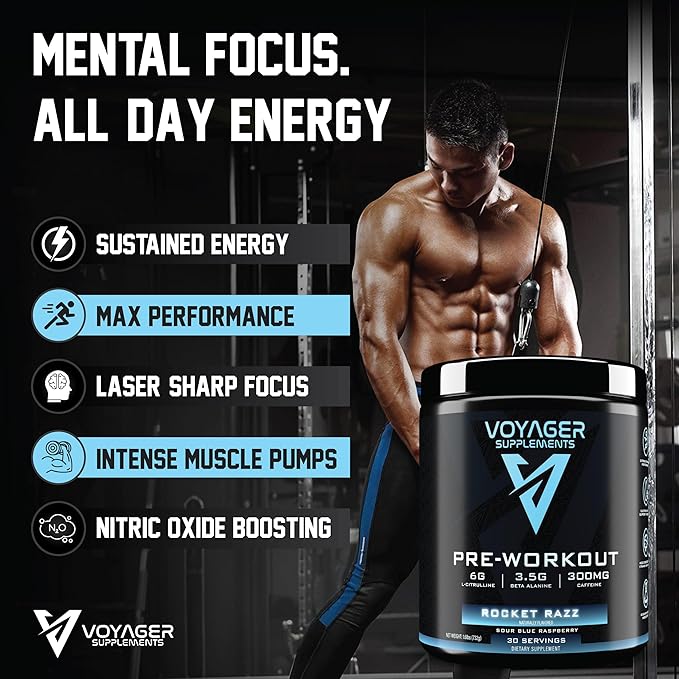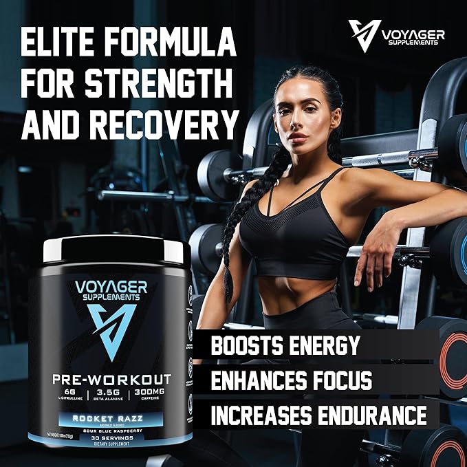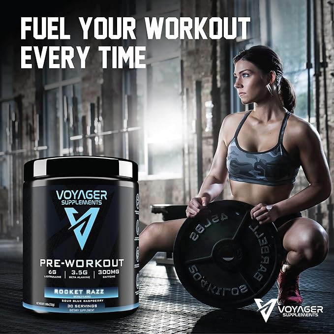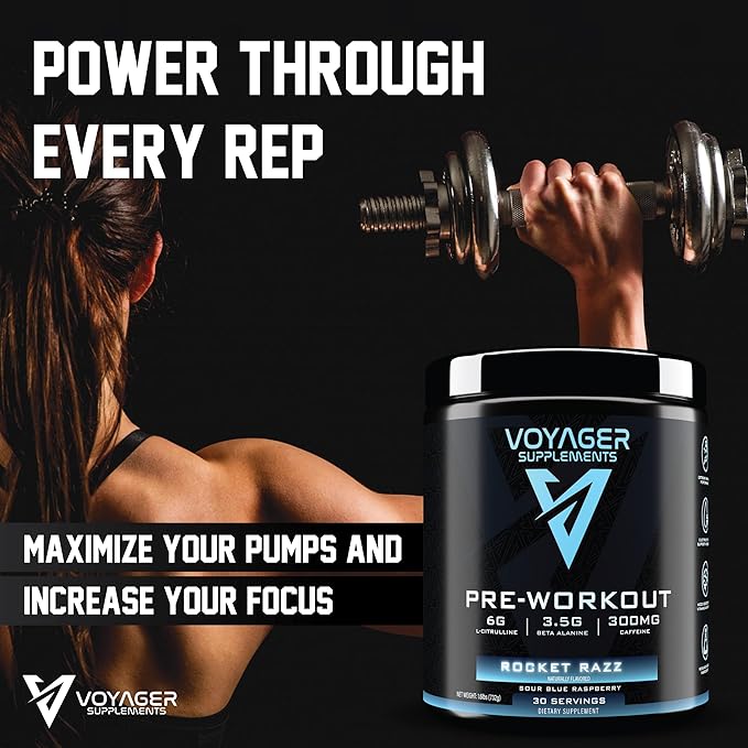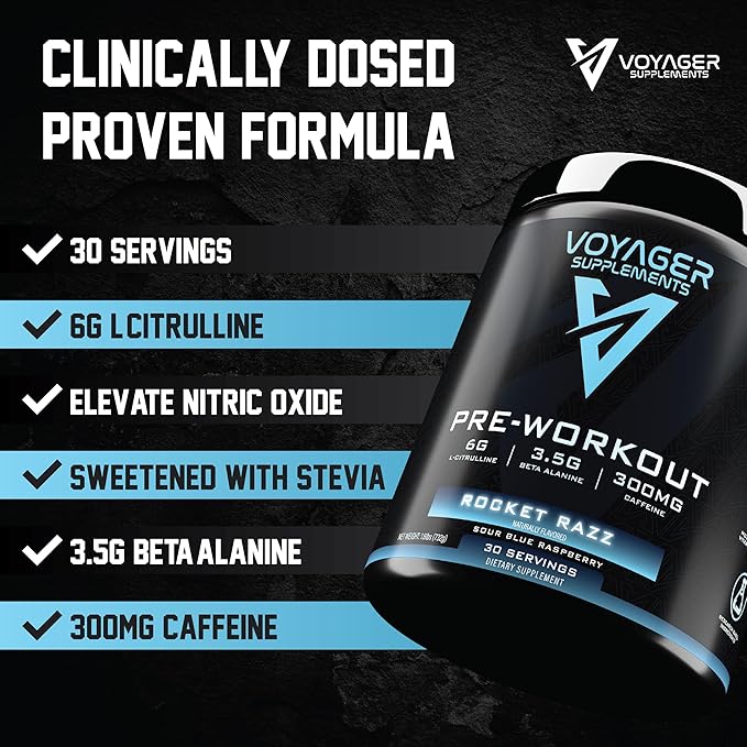 Voyager Pre-Workout Rocket Razz – Creatine-Free Powder w/L-Citrulline, Beta-Alanine, Caffeine – Supports Energy, Endurance & Focus – 30 Servings – No Artificial Fillers – GMP Certified