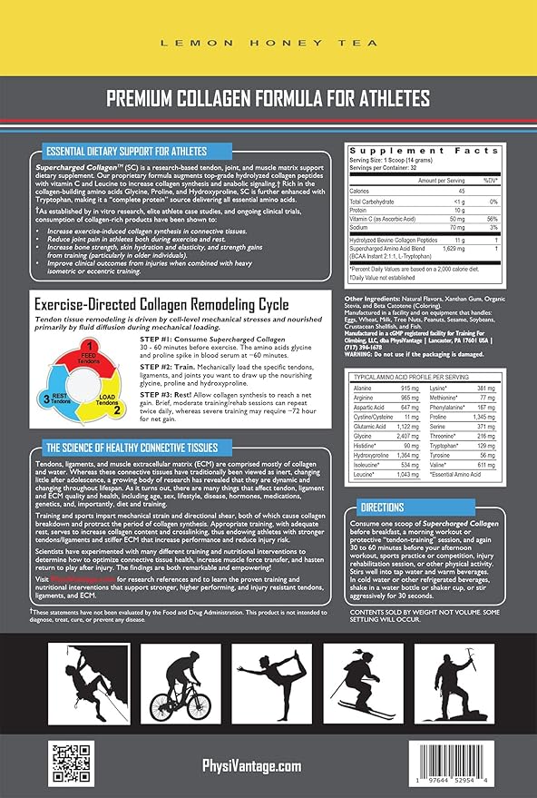 PhysiVantage Supercharged Collagen Peptides Powder - Hydrolyzed Collagen for Joint, Tendon, Ligament, & Skin Health - Lemon Honey Tea, Keto, Paleo, 16oz | Enhanced with Vitamin C, BCAAs, Grass-Fed