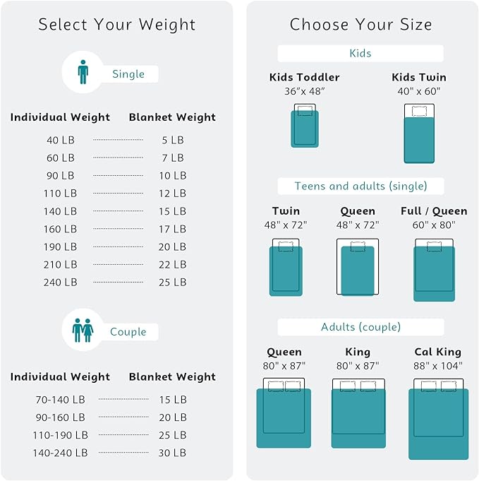 - Recommended Weight Size: Please choose 7%-12% of your body weight which would help you sleep better. We recommend 48''x72'' for twin bed, 60''x80'' for queen bed. This weighted throw blanket can be used while sleeping, reading, relaxing, or meditating