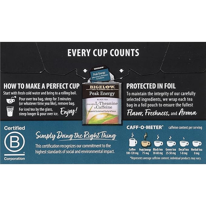 - Bigelow Peak Energy Black Tea, 18 Bags, Caffeinated, 1.39 Ounces (Pack Of 6)