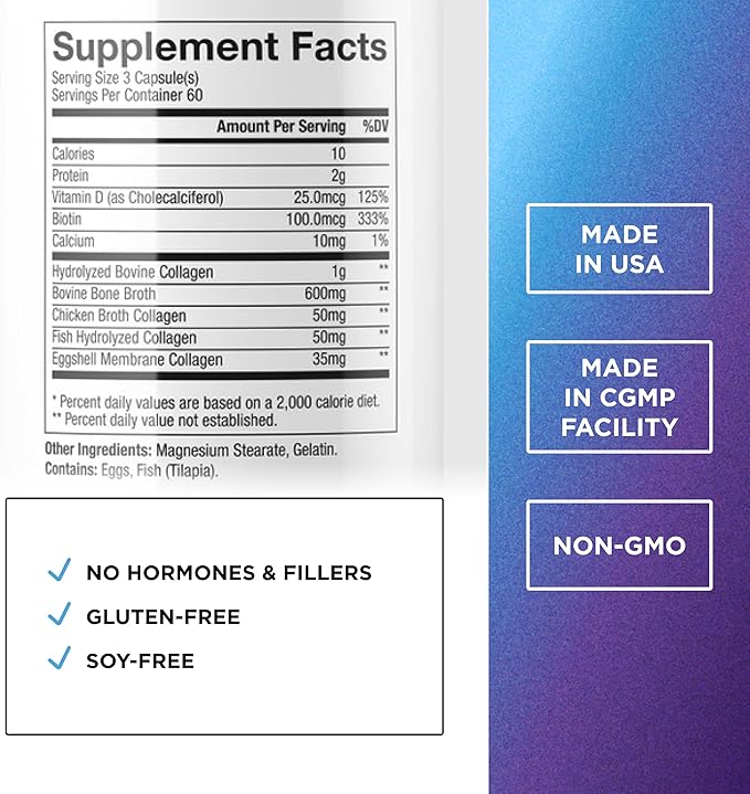 - All-in-one Collagen Pills: our bioavailable hydrolyzed collagen peptide pills feature a blend of 100% grass-fed bovine, chicken, eggshell and marine collagen sources, including Types I, II, III, V & X.