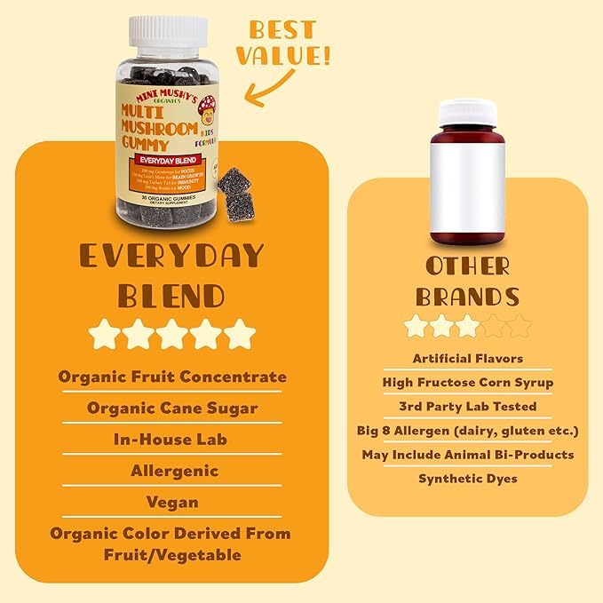 - The Perfect Solution: Looking for the perfect daily support gummy for your child? You've found it! Mini Mushy's Everyday Blend gummies are specifically created to support a holistic approach to your kid's well-being. Help them put their best foot forward with a boost to their wellness with easy-to-take gummies even the pickiest of eaters will love.