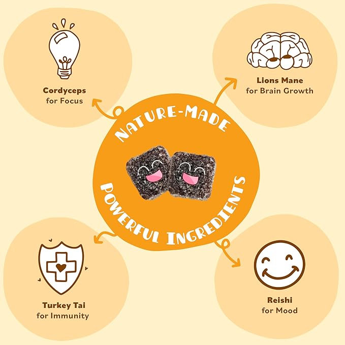 - The Power of Mushrooms: Unleash the power of one of Mother Nature's greatest superfoods - mushrooms! Our Everyday Blend gummies are holistically balanced to support your child's well-being. They include 200mg of Cordyceps for focus, 120mg of Lion's Mane to support brain growth, 200mg of Turkey Tail for immune support, and 200mg of Reishi to support your child's mood and recovery.
