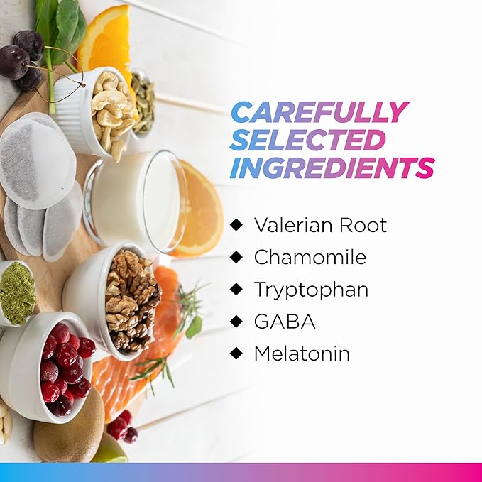 - NATURAL INGREDIENTS FOR DEEP SLEEP: Formulated with sleep-supporting ingredients like Valerian Root, Chamomile, L Tryptophan, GABA, and 5mg of Melatonin, this blend helps regulate sleep-wake cycles and soothe the mind for restorative sleep.