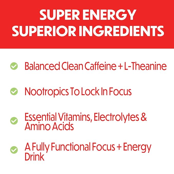 - Essential Energy - Packed with clean caffeine and loaded with Vitamin B12 makes this Super Drink your ultimate energy partner. This Super Drink gives you the morning kickstart you need, can boost your metabolism, mental clarity, laser focus and maximize endurance.