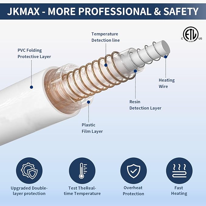 - SAFE CHOICE: JKMAX Heated blanket has passed UL 964 safety standard testing and obtained ETL certification, ensuring quality. The heating wire designed by a Japanese company through advanced technology has excellent insulation and stronger flame retardancy. The built in NTC overheat protection system actively monitors temperature to prevent overheating risks and ensure absolute safety during operation