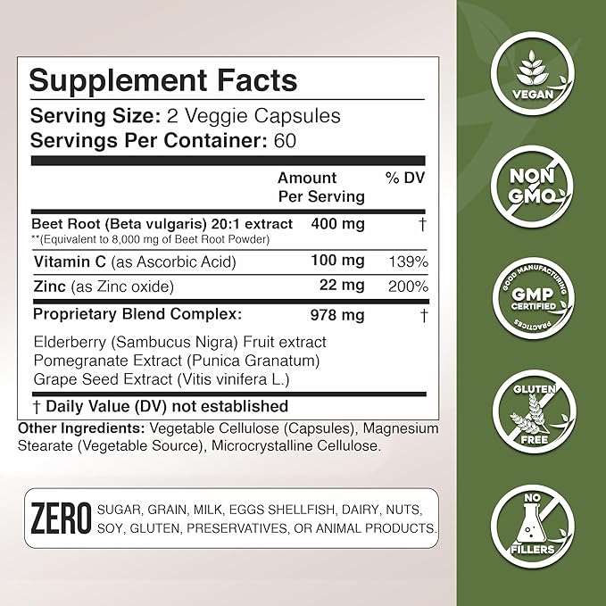 - EXTRA STRENGTH FORMULA: Gade Nutrition Beet Root capsules naturally contain beneficial nitrates that boost nitric oxide levels and improve overall circulation and blood flow. Our supplement is enriched with Sambucus Elderberry, Pomegranate, Grape Seed powder, Vitamin C, Vitamin A and Zinc. It’s a powerful compound to promote heart health, improve cognitive function, improve performance, and boost overall good health and well-being