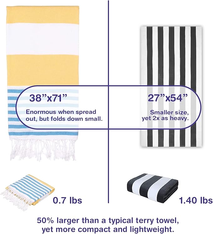 - THE PERFECT TRAVEL COMPANION: While more refined than the standard terrycloth, our Turkish towel doesn't compromise on its soaking capacity. Whether you're emerging from a shower or stepping out of the ocean, its svelte and airy nature ensures it fits snugly in any pack. Thoughtfully crafted, it's a space optimizer, making every journey a delight.
