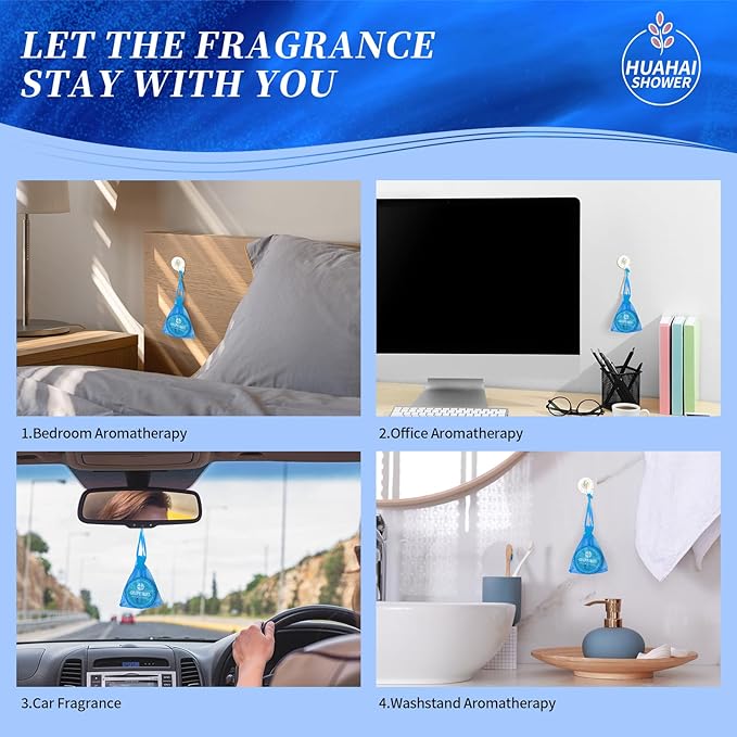 - [Newly Upgraded Usage] You can use the normal usage method, take out the tablets and put them into a small stream of water, for a better experience, please don't submerge the tablets, you can also use the hook mesh bag to hang it behind you where you can get water drenching of water so that you can smell the scent quicker, or you can hang it in your car, desk, bedside table, washstand, etc., and it will give out a light scent even when it's not submerged in water