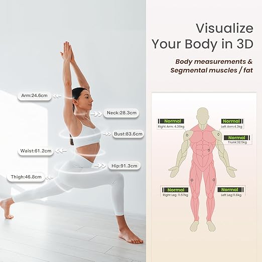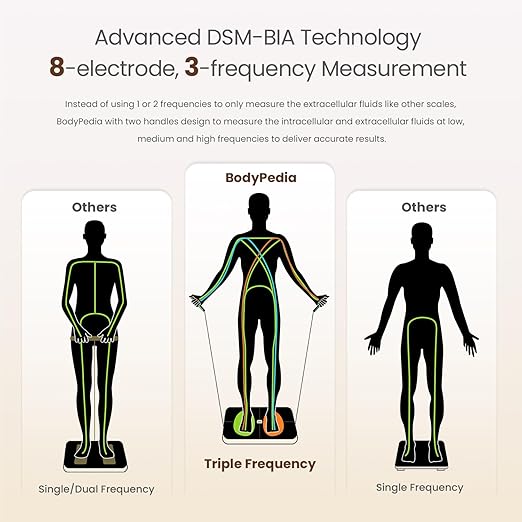 - 【Pro-Level Body Composition Analysis Monitor】BodyPedia processes data with triple-frequency BIA technology with 8 high-sensitivity electrodes and captures 43+ metrics through 3D body modeling and AI intelligent learning algorithms, outperforming basic 4-electrode scales with DSM-BIA scanning. Data accuracy down to 0.1lb/0.05kg (Maximum weight limit 330lb/150kg)