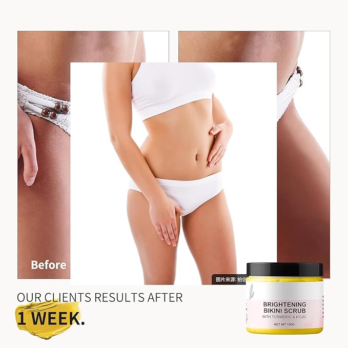 - EXFOLIATING SCRUB FOR BIKINI AREA WITH NATURAL INGREDIENTS: Our bikini scrub contains a smoothing skin complex derived from TURMERIC, KOJIC ACID, SHEA BUTTER, and other natural ingredients to provide long-lasting hydration and a dewy skin texture for your intimate body areas.