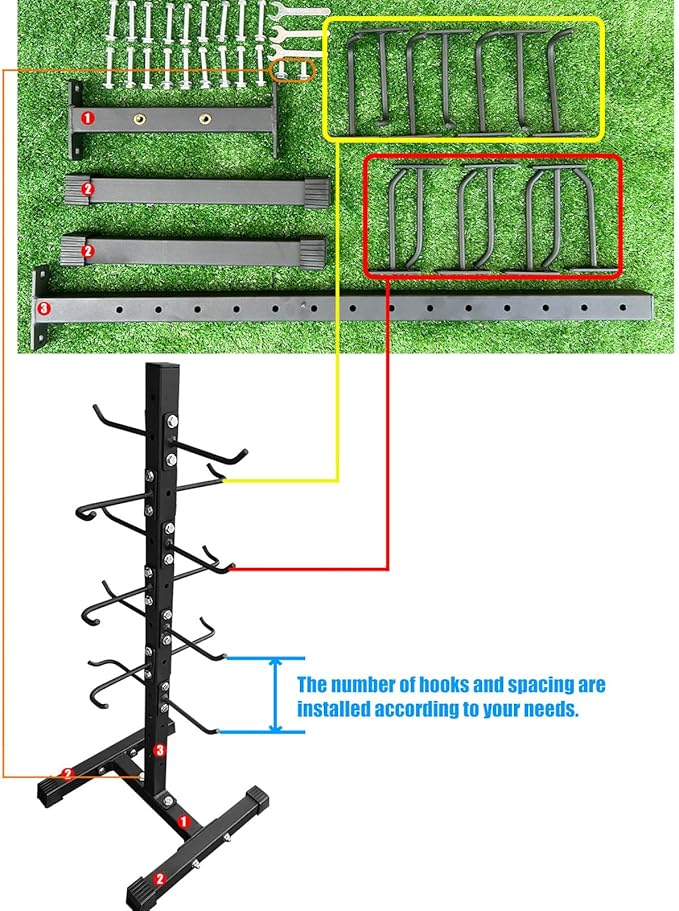 - Adjustable Hooks: Special designed with enough holes on the main steel tube, you can put the hooks in any post you want to storage the bars or any other cable attachments