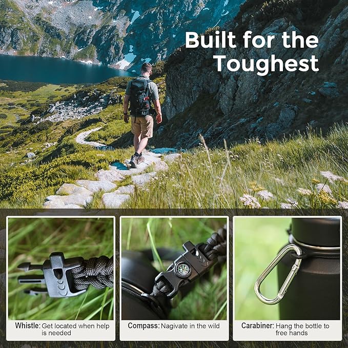 - The Go-easy Water Bottle: Benefit from the cool features of this bottle with a built-in ergonomic handle and the straw lid ensures you chug at ease anytime, while chug lid allows you to refresh in huge gulps when a quick boost is called for. Plus, survival paracord integrating a whistle and compass for extra portability and practicality
