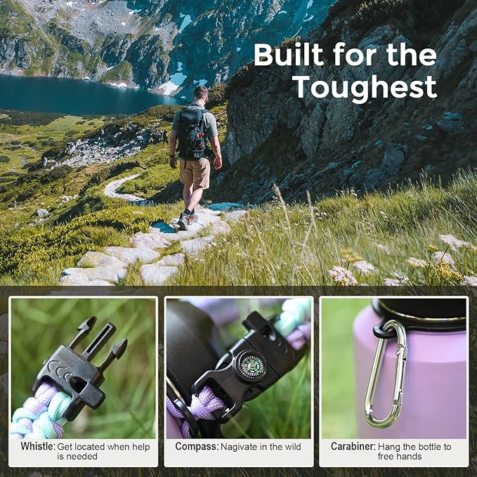 - The Go-easy Water Bottle: Benefit from the cool features of this bottle with a built-in ergonomic handle and the straw lid ensures you chug at ease anytime, while chug lid allows you to refresh in huge gulps when a quick boost is called for. Plus, survival paracord integrating a whistle and compass for extra portability and practicality