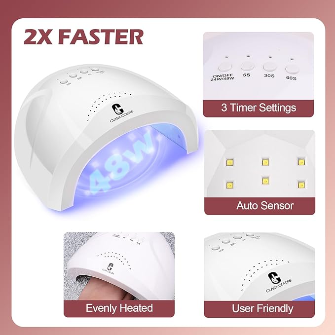 - 【QUICK-DRYING UV LED LAMP】Our gel nail set with 48W powerful nail lamp, it has a LCD display and 3 curing modes, 5s, 30s, 60s. And it contains 30 dual-light source lamp beads and can cure each nail in all directions, which cures quickly; Besides, the auto sensors on the lamp control the light, just put your hand in and the light will turn on automatic light, release, the light will automatically go out. Suitable for professional salons and personal families.