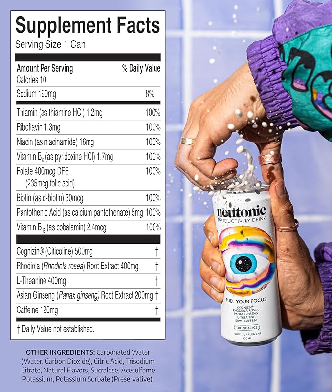 Neutonic Nootropic Productivity Energy Drink | Tropical Ice 12 Cans | 120mg Natural Caffeine, Zero Sugar | Support Memory, Mental Clarity, Cognitive Function | Boost Focus, Energy, Brain Health