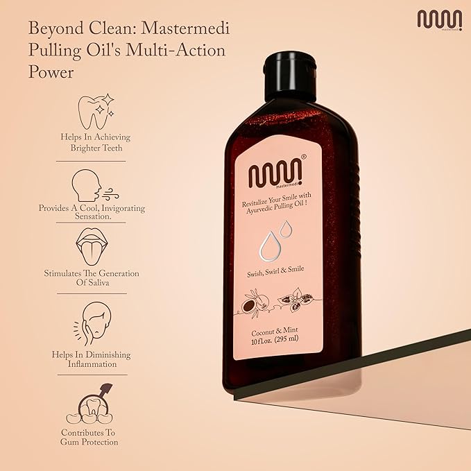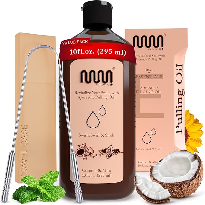 MasterMedi Coconut and Peppermint Oil Pulling (10 Fl.Oz), Mouthwash with Tongue Scraper, Alcohol Free Natural Coconut Oil Pulling for Teeth Whitening,Fresh Breath and Healthier Gum (Pack of 1)