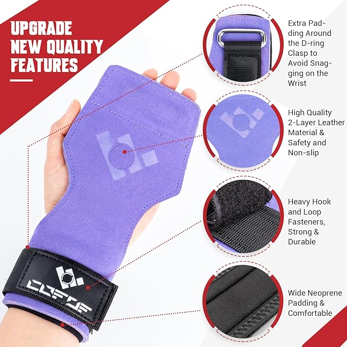- Upgraded Weightlifting Wrist Strap: Our lifting wrist straps are made of double layers soft leather which is high quality and ergonomically designed to fit your hands and provide better grip. Adding extra padding around the D-shaped metal ring clasp keep your wrist from being squeezed and feel painful. Weightlifting strap with high-density hook and loop can be easily worn on the wrist, and take off and put on freely by yourself. Widened neoprene pad makes you feel comfortable.