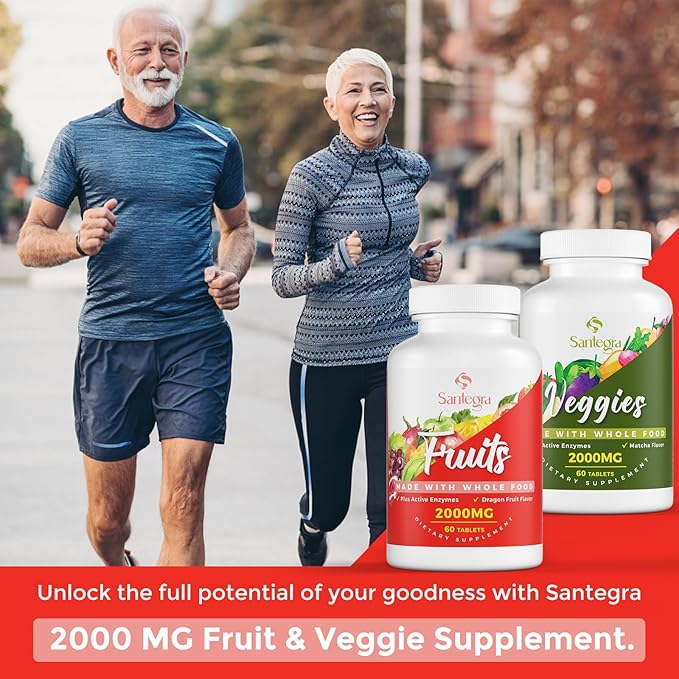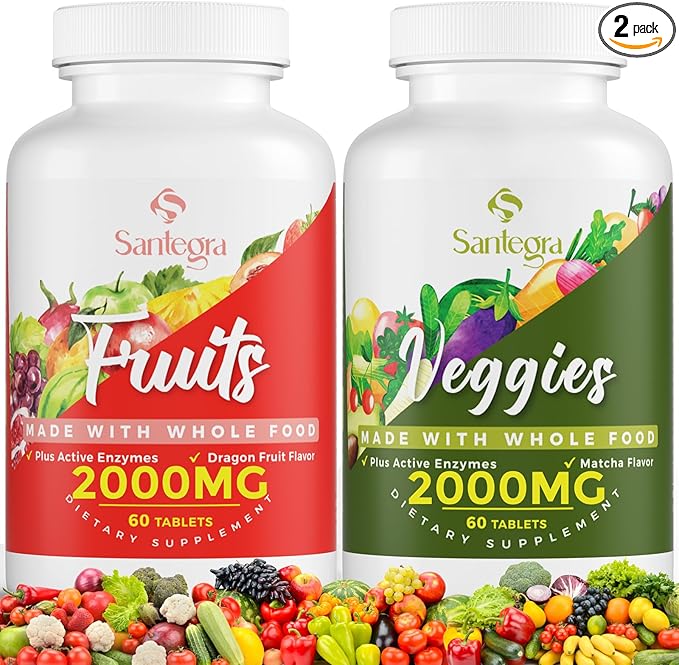 - ๐35 Unique Fruit and Veggie Blend: The fruit tablets contain a blend of 18 fruit and the veggie tablets pack in 17 vegetablesโwith zero additives. Whole veggies and fruits are packed with vitamins, minerals, and fiber, & nutrition experts unanimously agree that they're essential for any well-being diet. Santegra's fruit and veggies supplements are more effective in digestion, sharp mind, immune system, energy management, and overall well-being in your daily life.