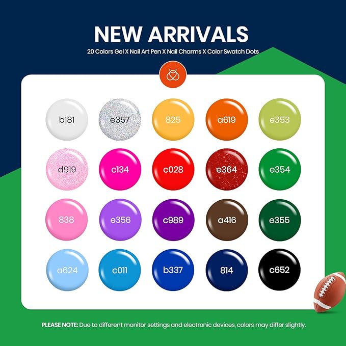 - 【Personalized Style】Christmas gel nail polish in 20 neon shades is a must-have color for spring and summer! 20 X Mini Gel Colors (5ml/each bottle) + 3 x No Wipe Base and Glossy & Matte Top Coat ( 7.5ml/ each bottle). Double-ended Brush*1,Ball slicing accessories*1, Color card beans*3. Sports trend Blokecore will ignite your summer sports passion! This set perfectly combines the power of sports with the energy of summer.