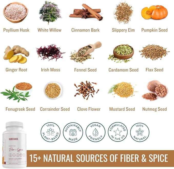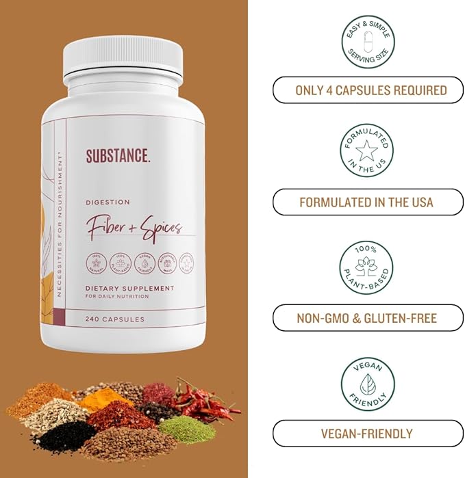 SUBSTANCE. - Nature's Fiber & Spices for Digestive Wellness - Supports Colon Cleanse - Formulated with Psyllium Husk, Flax Seed & Ginger - Dietary Fiber Supplement - Vegan-Friendly - 240 Capsule