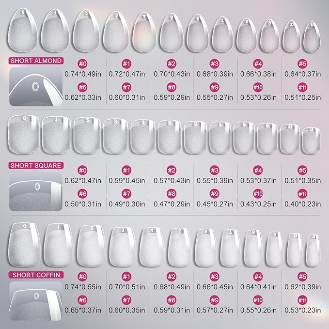 - 【Various Sizes】: There are 720PCS of three different short nail tips, including 240PCS of almond nails, square nail tips and coffin fake false, 12 sizes for each style; 3in1 nail tips set length is different, 3 styles false nail tips can meet your various needs; Combining various style of full nail tips kit brings convenience to you, saves your money and can make you try more design you like on different false nails.