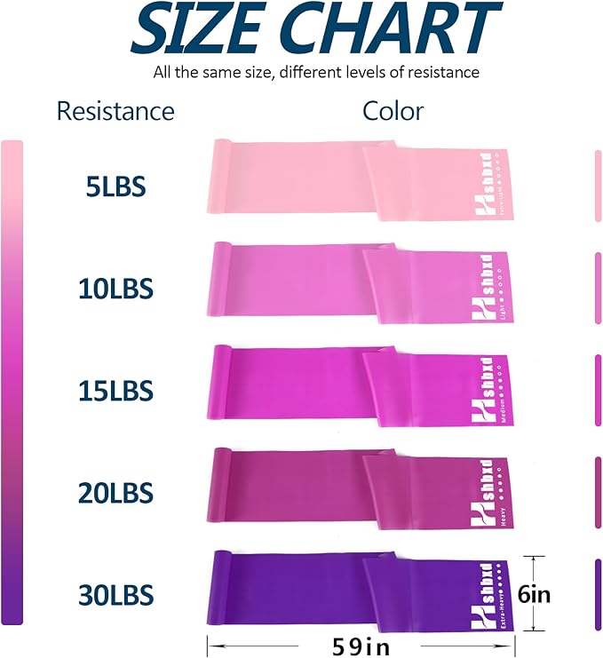 - Upgrade - Resistance band with handles, comes with door anchors and simple instructions. 5 Levels of Resistance, 5 resistance bands are 59in (150cm) long and 5.9in (15cm) wide, the 5 color resistance bands is yellow band (5 lbs), red band (10 lbs), green band (15 lbs), blue strap (20 lbs), gray strap (30 lbs). Additionally, the darker the gray and pink resistance bands, the heavier the resistance.