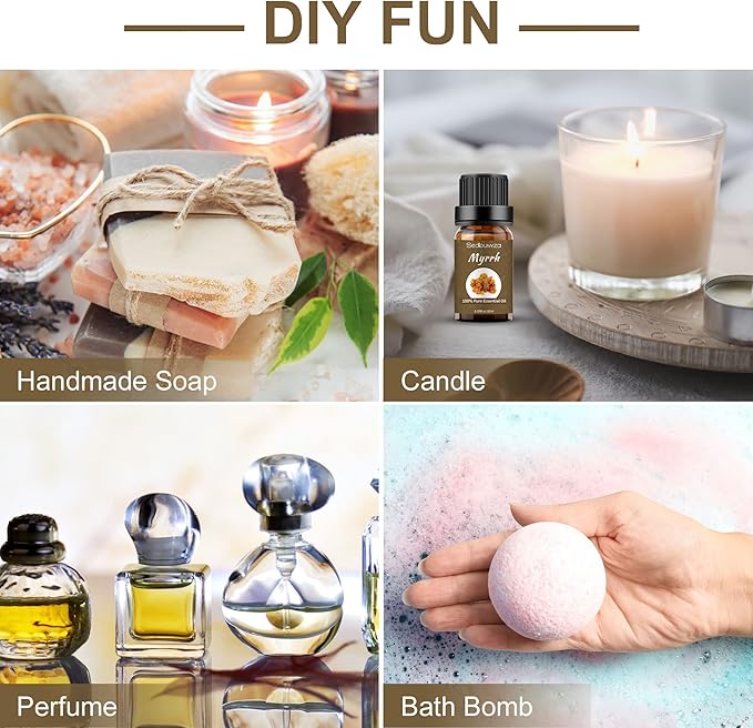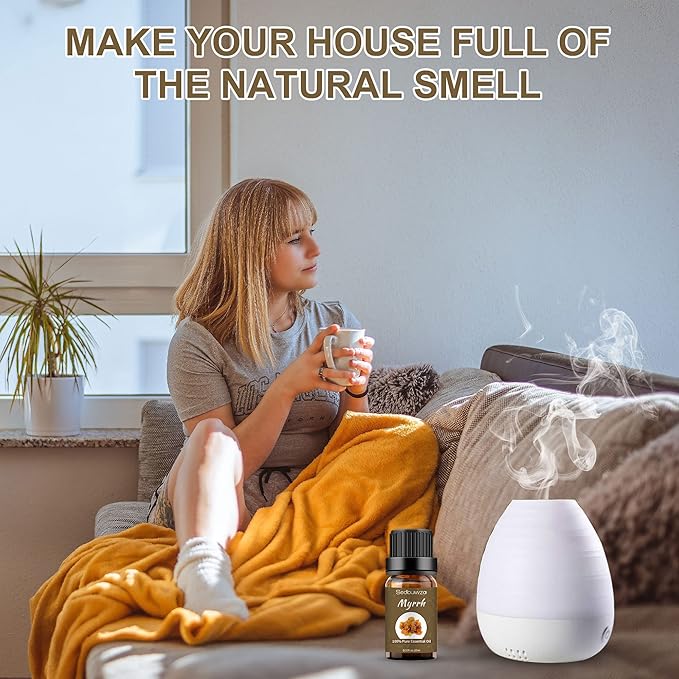 - Pure Myrrh Oil: Myrrh essential oil is extracted by steam distillation from the resin flowing from the branches of the shrubs. It has the unique strong smoke and bitterness of the gum, a dry and aromatic blend, and the smell is like musk, which makes you feel warm and pleasant.