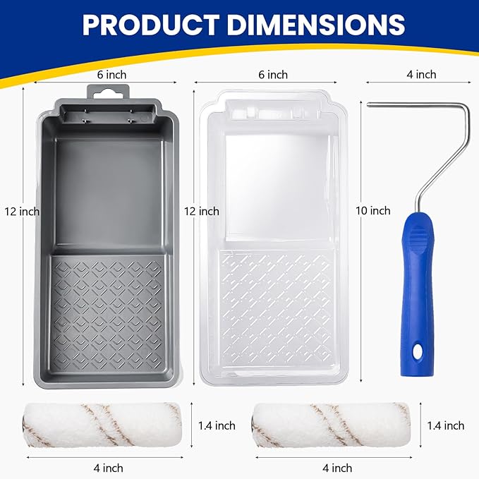 - Complete Kit: Our mini paint roller kit includes 16 pieces, including 4 inch microfiber paint roller covers, 4 inch plastic paint tray, 4 inch paint tray liner and 4 inch paint roller frame, everything you need for house painting