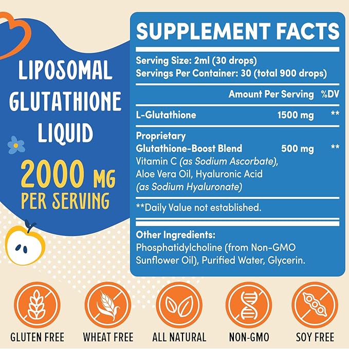 - Potent Formulation, A True Antioxidant Boost - Each drop of our liposomal glutathione supplement is a powerhouse of health-boosting ingredients. Total 2000 mg contains 1500 mg of L-Glutathione combined with the synergistic benefits of Vitamin C, Aloe Vera Oil, and Hyaluronic Acid, you're not just getting a supplement. This comprehensive blend provides a powerful antioxidant that helps to eliminate free radicals and protect your cell from damage.
