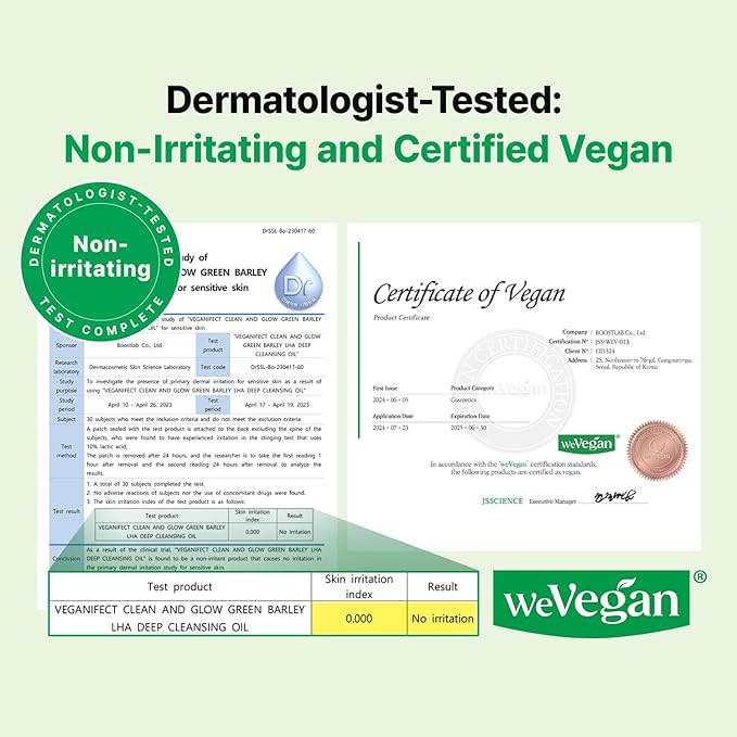 - Proven Results – Clinical trials have shown effective cleansing performance with VEGANIFECT Green Barley Cleansing Oil: 99.27% Makeup Removal, 91.28% Impurity Cleansing, 35.24% Blackhead Reduction after a single use. Individual results may vary.