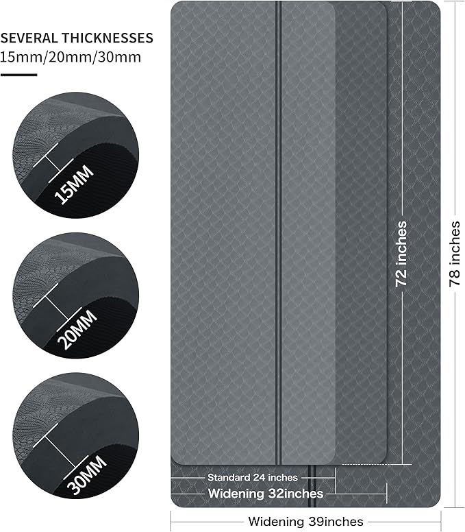 - ๐นEXTRA LONG EXTRA WIDE: nuveti's 72"x32"/78"x36" offers adequate space to fit any type of exercise like yoga, pilates, bikram, and fitness exercise.Most yoga mats on the market are 6mm, 8mm or even thinner. This yoga mat is thickened to 15mm,20mm,30mm which can provide more support and protection for your ankle, knees, joints, and body on hard floors, as well as absorbs vibration and reduces noise.