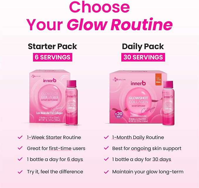 - INNERB GLOWSHOT COLLAGEN (1.7fl oz, 30 servings) - Low-molecular fish collagen with an average size of 800 Da or less ensures superior absorption by the skin, promoting improved elasticity, hydration.
