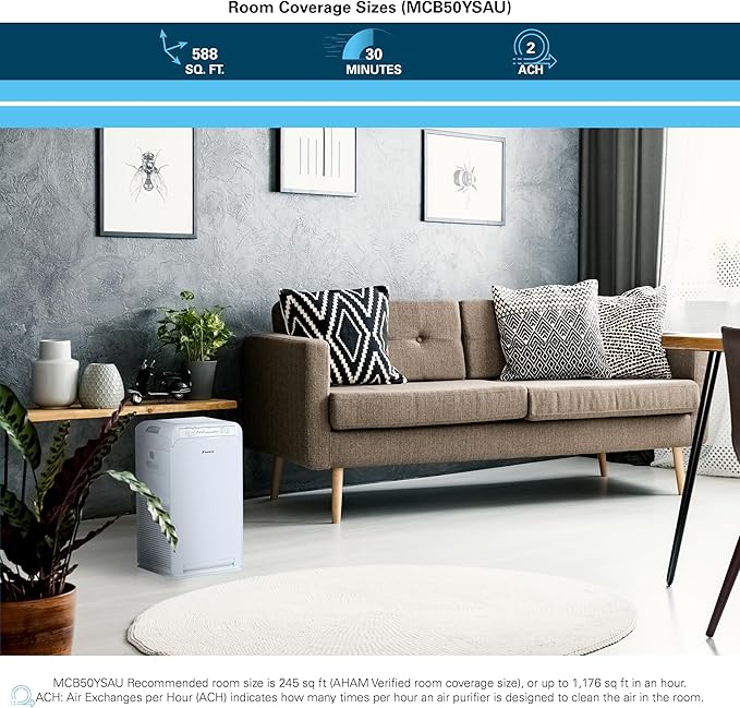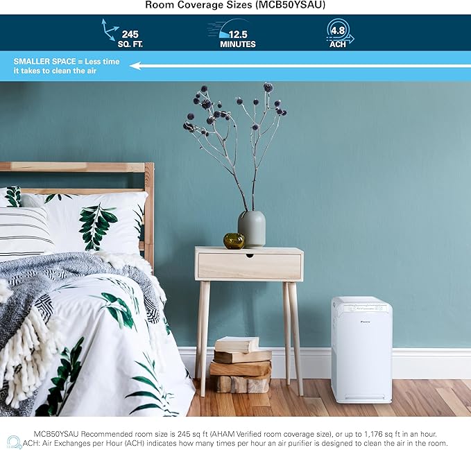 - CLEAN AND FRESH AIR: With 3 directional air suction and powerful purification system, this air purifier cleans the air in a room size of 245 sq ft at 4.8 air exchange rate (AHAM Verified room coverage size), or up to 1,176 sq ft in an hour.