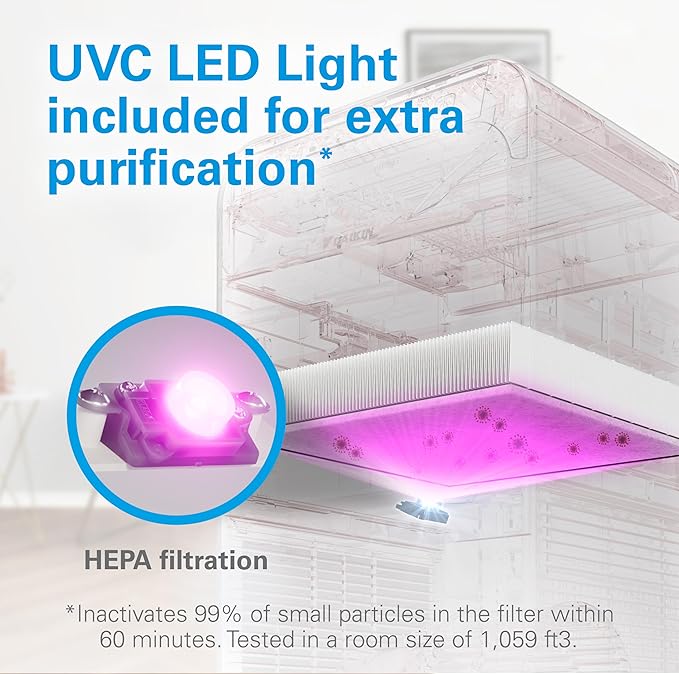 - THREE-STAGE AIR FILTRATION: Powerful filtration starts with pre-filters and a HEPA filter to reduce harmful particulates. A carbon filter then removes odor-causing particles, while UVC LED Light technology inactivates bacteria and viruses that are trapped in the HEPA filter. Improves air quality by capturing airborne irritants so tiny, you may not even know they're there!