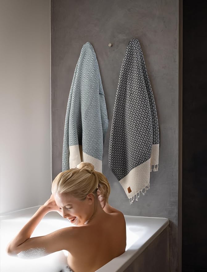- NO MORE DAMP DISCOMFORT: Our Turkish bath towels set redefines convenience with their quick-dry feature. In mere minutes, the Turkish towel dries completely, leaving no room for moisture or unpleasant odors. Use a quick drying towel that easily shakes off sand.