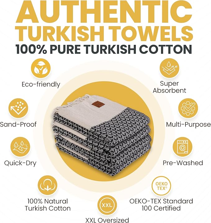 - OEKO-TEX CERTIFIED ECO-FRIENDLINESS: Proudly certified by OEKO-TEX Standard 100, the quick dry beach towel set is free of harmful chemicals. With every use, you contribute to a green lifestyle while enjoying the softness and absorbency that only Turkish cotton can offer.