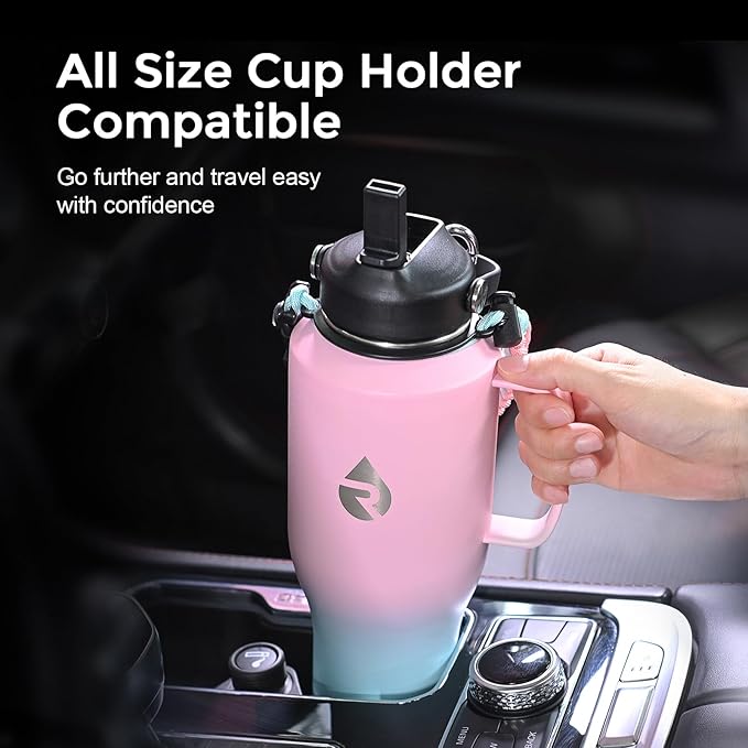 - The Go-anywhere Insulated Water Bottle: T-shape design sports a sleek and ice cream cone profile that fits in any car cup holder, so that you can tote it around with zero effort. This 32/40oz water bottle with straw is best and ideal for driving, commute, travel, camp, etc